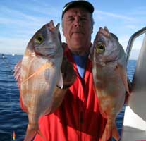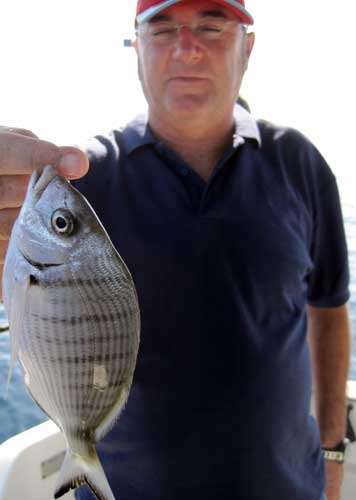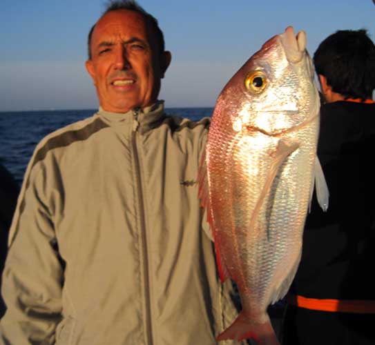 Arriba a la izda , David con nuestro primer pagel de la mañana.Un buen ejemplar de mas de medio kilo de peso. En el centro, el patrón con otro buen ejemplar. A la derecha el otro tripulante, Jaime, con dos pagelones que salieron al mismo tiempo en dos cañas distintas. Se aprecian en todos ellos, las bandas las rojizas y claras, alternando, que presentan, casi todos los peces recién salidos del agua, a causa del stress.Pulsen imágenes para ampliar