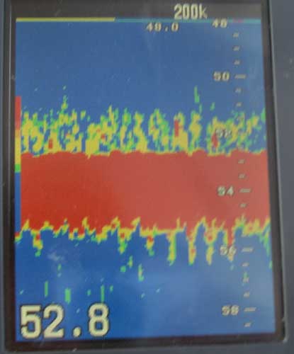 | Pageles, pargos y vidriadas . Bajo una modesta pesquera hecha a mediados del mes en dos caladeros. Los dos con aparentemente bastante pescado en sonda y con vegetación sugerente. En el primero, a la izquierda, el exceso de morralla nos impidió capturar mas pageles. En el 2º logramos algun pargo chopas medianas y vidriadas . Pulse imágenes para ampliar |