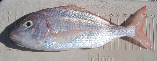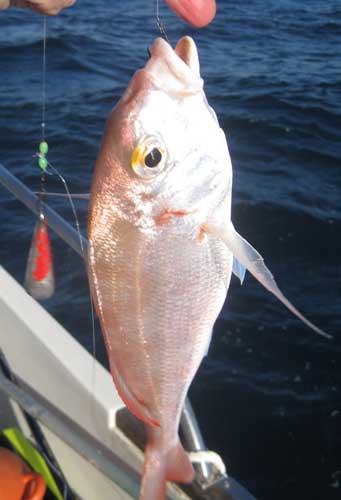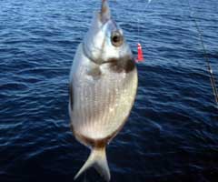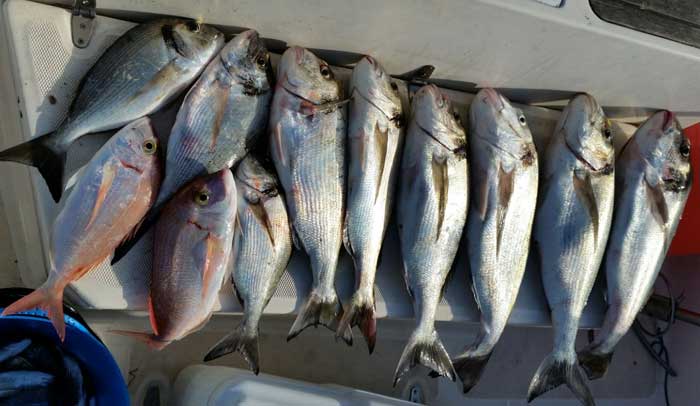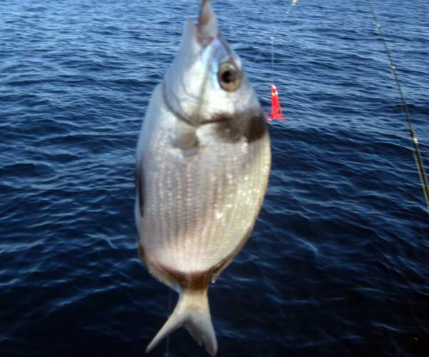 | Arriba a la izquierda una buena mojarra o vidriada . En el centro un pagel de 400 g.. Observe que en terminal del aparejo, colocamos bolitas fluorescentes y plomo rojizo para atraer la atención. A la derecha el patrón con un pargo de mas de medio kilo |
