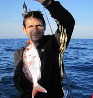 | El día 1, a bordo del GLAND fuimos a pescar sobre los fondos rocosos de la larga cordillera submarina del Carrilón, frente al Mar Menor. Fue sorprendente. En mi primera calada poco después del amanecer, una picada sutil bajando la puntera de la caña suavemente y una perdida de peso brusca de la plomada, seguida de un amplio tirón por mi parte, me proporcionó la primera emoción de la nañana, en forma de un pagelón de cerca de l kilo que me divirtió por su bravura. Poco después Jose Manuel, levantaba un bonito pargo. Poco a poco los demás mienbros de la tripulación, el maestro y Luis levantaban sendas presas La mañana empezaba pues, muy bién, pues los toques eran frecuentes. Lástima que la corriente, la mar muy molesta con olas de medio metro y el viento, nos rolará la embarcación, con lo que hubo un momento en el que el pescado dejó de comer. Bajo, vean unas cuantas imágenes de ese día . Pulsen imágenes para ampliar |