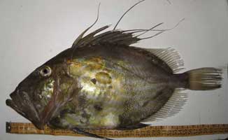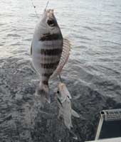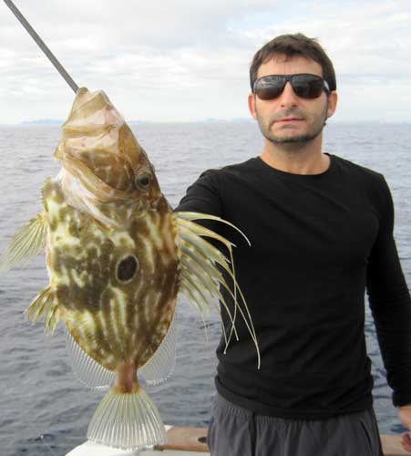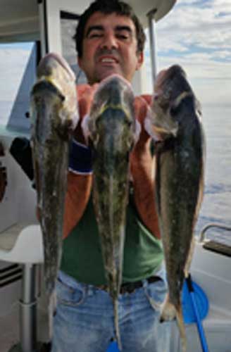 | A la derecha seriola o lecha, segun acepcion local, pescada al jiggig, con una halco de 40 gr.. En el centro el patrón, con un gallo de 41,5 cm y cerca del kilo de peso. A la derecha: un doblete de chopas de un tamaño de 150 a 250 gr, de los varios que salieron.. Chopas que se mostraron muy activas en la primera hora de pesca, en aguas del Carrilón. |