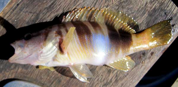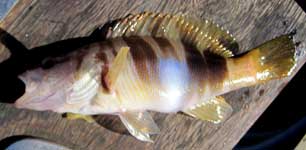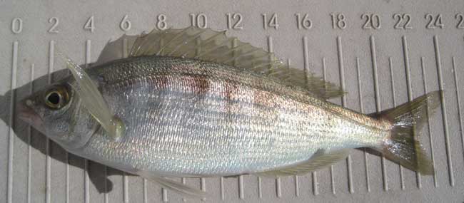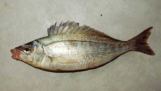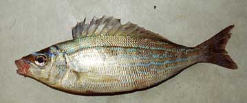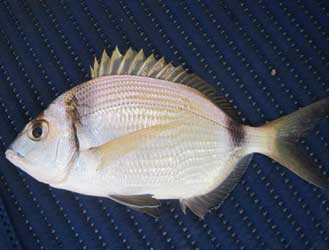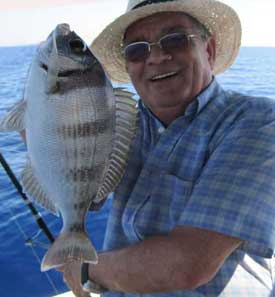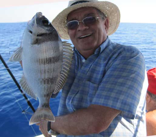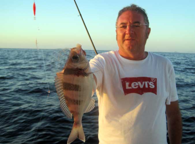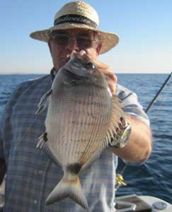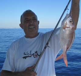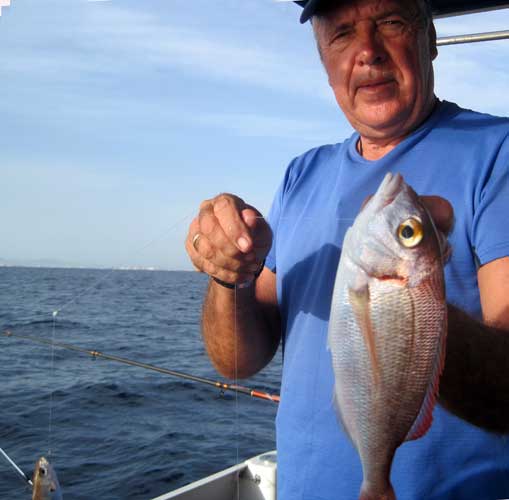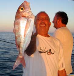 | El primer pagel, de unos 400 gr, salió poco despues de amanecer, pescando con langostino.A la derecha otro de los pageles |