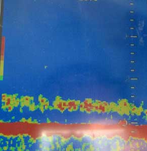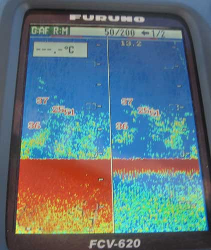 | Arriba, doblete de besugos aligotes y a su derecha aspecto de la sonda con besugos chopas y algún calamar . Pulse para ampliar |