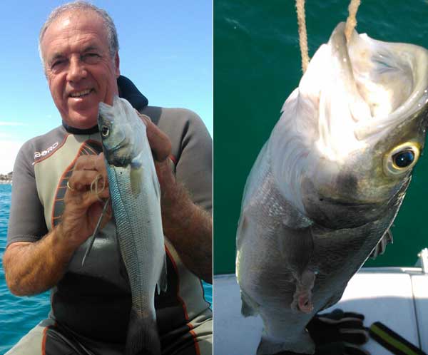 Arriba a la izquierda un triple de aligotes. En el Centro triple de chopa y besugos. A la derecha, Jaime muestra un doble de pagel y besugo . Es también, Jaime, un aficionado al submarinismo. A petición mía, me envía una de sus últimas capturas. Lubinas pescadas cerca del espigón de poniente. Pulse aquí