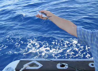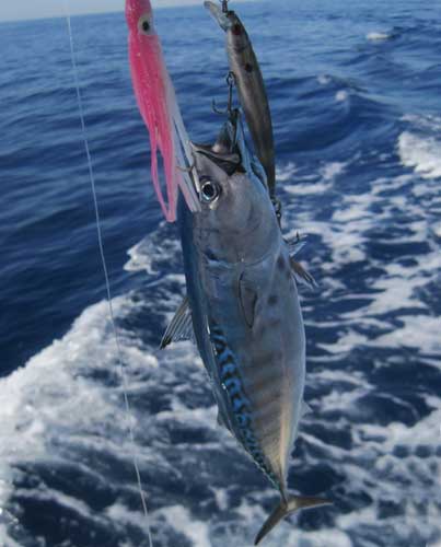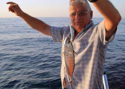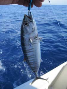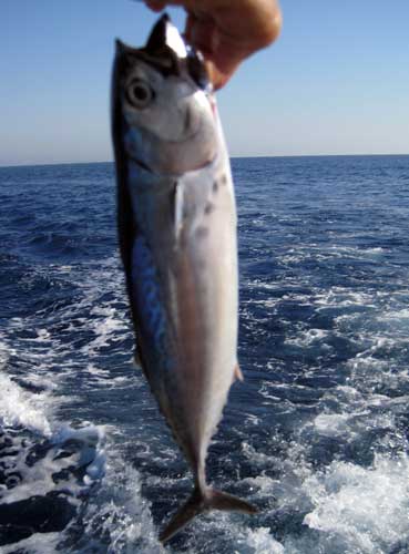 De regreso al puerto curricaneamos para tratar de detectar la aparición de llampugas en la zona, con nulo resultado. Solo encontramos bacoretas pequeñas y pequeños atunes de unos 150 gr.