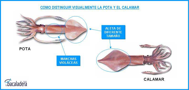 Para diferenciarlos podemos fijarnos en las dos aletas que poseen en la parte final del cuerpo, las aletas del calamar ocupan unos 2/3 de la longitud de su cuerpo una vez eliminada la cabeza, mientras que las aletas de la pota ocupan una tercera parte. Vea el dibujo procedente de la web: bacaladera,com |