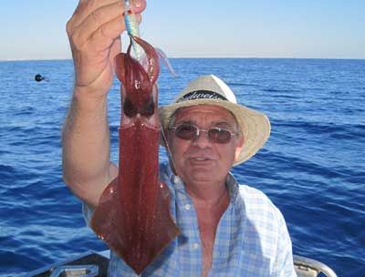 Al subir el primero, pensé por su colorido rojo y su forma muy alargada, que era una pota (tarodes sagitatus) en vez de un calamar (Loligo vulgaris) .