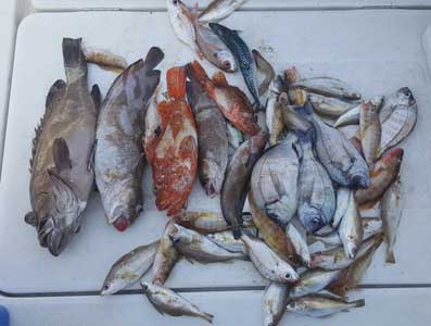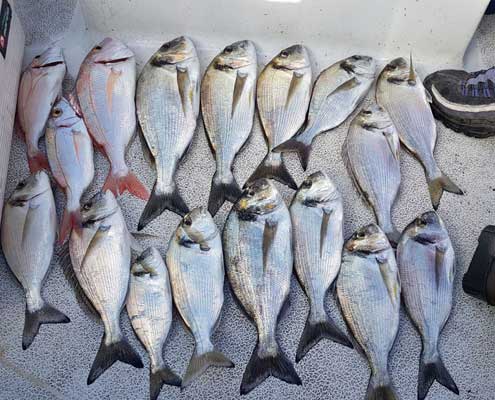 | Como todos los años , por estas fechas, y en caladeros tradicionales, se estan haciendo algunas buenas pesqueras de doradas. Muestra de una de ellas, son las imagenes que incluyo . Una de ellas de pageles y doradas, de tamaño mediano y algunas mayores, remitidas por un buen amigo. La publico, porque pese a su abundancia, no sobrepasaron el cupo de 5 kilos por pescador y dia, como es lo preceptivo |