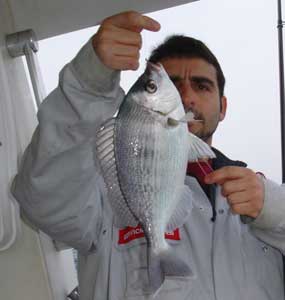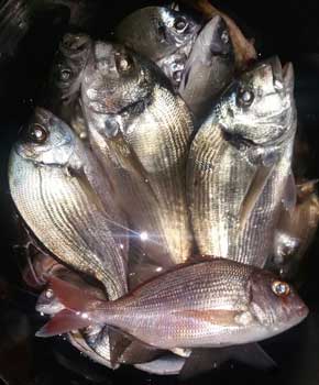 A la derecha otra buena pesquera de Pedro, un veterano pescador,( que hoy recibo gustoso en esta web), hecha a finales de diciembre: Doradas, alguna de kilo y medio chopas , un buen pargo, y vidriadas, pescadas en unos 35 m. de sonda cerca de la costa de Torrevieja. Pulse imágenes para ampliar |