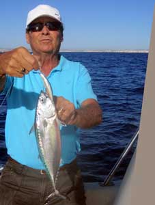 Asi lo hicimos, una vez fondeados, con los primeros claros del día, pescando además, con tres cañas con anzuelo pequeño para conseguir vivos. Pronto, en la sonda, vimos imágenes de manchitas rojas densas y aisladas que indicaban probablemente la presencia de sorelas o caballas. Iniciamos, alguno de a bordo esta pesca, cebando nuestreos anzuelos con trozos de sardina y /o langostino.