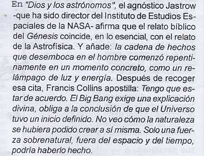 Copio seguidamente dos interesantes declaraciones de científicos de talla mundial como son Francis Colling. Director del Instituto Nacional Americano para la Investigacion del Genoma humano y el agnostico Jastrow Hastrow, Director de los Estudios Espaciales de la Nasa |