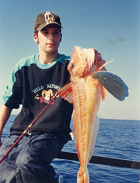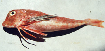 Hacemos unas fotos del momento. Ya a bordo el pescado, Manolo sonríe de oreja a oreja. El nombre local de chirriola corresponde a la lucerna bejel o colorado (Trigla Lucerna), ejemplar de la familia de los tríglidos o rubios que entre otras características (como es la trasformación de las primeras aletas ventrales en patas muy sensitivas e incluso gustativas) tiene la facultad de emitir sonidos al hacer vibrar su vejiga natatoria. Vea bajo otrasdos variedades el graneoo escacho (Trigla Lyra) y a la derecha el rubio o Trigloporus lastoviza