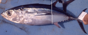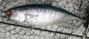 El llamado bonito del norte o albacora (thunnus alalunga) no tiene nada que ver con este. Se le captura también en el Mediterráneo a unas 30 o 40 millas de la costa. Su característica mas notable es la enorme longitud de sus aletas pectorales que alcanzan su segunda dorsal. Ponemos de nuevo proa al sol y al poco es la caña fina la que se arquea y empieza a soltar línea Esta vez trabajo yo el pescado. Ajusto el freno y empiezo a cobrar. La caña se curva y la chicharra del freno suena con estridencia. El pescado busca la profundidad pero poco a poco lo acerco. Es un joven atún de unos 800 gr. He tenido la precaución de sustituir la potera que llevaba el pequeño calamar rojo, por un simple anzuelo, por lo que no daño casi su boca. Con gusto lo devolvemos a la mar, deseando que dentro de 7 u 8 años se haga un buen mozo de 80 a 90 kilos. Mas tarde y en una zona marcada por el averío de pardelas, charranes y gaviotas, localizamos un pequeño banco de bacoretas cebándose en superficie. Conseguimos unas cuantas. Su característica mas notable es la presencia en el dorso de unos dibujos sinuosos algo semejantes a los de la melva, pero además presenta en su zona pectoral 5 o 6 manchas oscuras muy típicas.