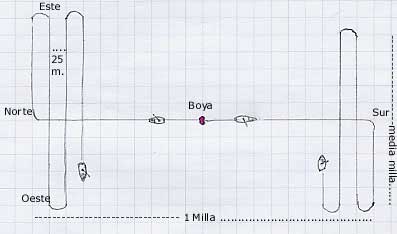 | Con esta situación aproximada introducida en la pantalla de nuestro Loran, una mañana de primavera, con la mar en calma, salimos de Torrevieja rumbo al lugar del naufragio. Tras una hora y media de navegación llegamos a la probable situación del pecio. Sabíamos que el Loran C nos daba un error posible de casi media milla.