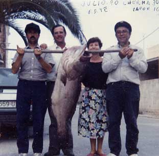 | Arriba lo que incialmete tomamos por una gran cherna y que despés comprobamos que era un mero denton de cerca de 30 kg. La foto de la derecha está fechada en julio del 90 |