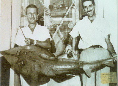 CORVINA o REIG( Argyrosomus regius). Pertenece a la familia de los sciénidos lo mismo que la corva o el verrugato. Puede alcanzar los 50 kilos. El ejemplar presentado pescado en la bahía de Torrevieja en 1955 por Pérez Pareja pesó 42 kg . El último ejemplar capturado por un pescador deportivo local lo fue en 1.976. Las fotos antiguas de esta serie pertenecen al archivo de M. Guardiola. Gracias por ello . Foto2-84-A . GUITARRÓN ( Rhinobatos cemiculus). Es llamado localmente REJA. Pertenece junto al PEZ GUITARRA ( Rhinobatos rhinobatos) a la misma familia. Se diferencian en que la prominencia rostral del GUITARRON tiene una quilla cartilaginosa que converge en su parte central. Alcanza un tamaño considerablemente mayor que su pariente el pez guitarra. Este fué capturado por A. Pascual del Riquelme y R.Genovés en C. Roig (Torrevieja).Pesó 17 kilos y midió 2 metros , tamaño máximo para su especie. Foto colocada a comienzos del artículo
