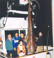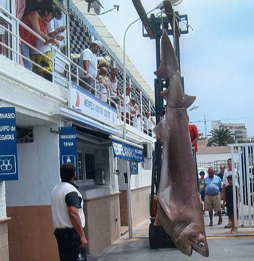 La alegría reina a bordo, pues puede que el sitio esté “virgen” y nunca haya bajado aquí un anzuelo. Félix lleva de nuevo el barco al sitio marcado previamente en la pantalla del plotter del G.P.S. para intentar derivar hacia el mismo sitio. Calan de nuevo las dos cañas. Al acercarse de nuevo, según indica la sonda, casi arriba del cantil submarino, una fuerza increíble tira de la línea del carrete haciéndole perder sedal rápidamente al tiempo que la caña se incurva peligrosamente. No es un enroque pues la deriva del barco es ahora muy lenta. Aflojan algo el freno del carrete para que no se rompan ni el sedal ni la caña, y el pescado hace una larga salida en la que se lleva mas de 300 metros de línea. Llega un momento en el que el pescado que se debate en el abismo de las profundidades marinas, parece que se cansa por lo que Félix aprieta algo el freno del carrete. A veces este patina pero poco a poco va cobrando sedal, ayudándole manualmente el pescador. Las salidas de línea y la lenta recogida se alternan, pero poco a poco aquel tremendo animal es izado del fondo. A bordo no tienen prisa. Es muy importante que el pescado al que suponen una enorme cherna llegue muy fatigado. Pronto se dan cuenta que debe ser otra cosa, por la gran resistencia que ofrece. En este momento el bicho tira inconteniblemente hacia abajo y mas cien metros de línea, ya recuperada, es cedida de nuevo. El tiempo pasa rápidamente. Llevan ya dos horas de lucha. Ahora si que notan señales de cansancio en aquel animal. La caña sigue hecha un arco pero el carrete ayudado por Felix recoge línea de una manera regular llenando esta poco a poco el tambor del mismo. Cuando faltan 15 o 20 metros , Pepe asomado por la borda exclama: -¡Madre mía!.¿ Que es eso? ¡Es enorme! ¡Si es un tiburón..! Eduardo impone la calma. Prepara dos bicheros previamente amarrados a puntos firmes de la borda. Se calzan Felix y él unos guantes Abre la portezuela de popa y pasa a la platafoma de baño. Felix aguanta como puede las tarascadas del bicho que ahora junto al barco se revuelve. Hábilmente Eduardo le clava con decisión el primer bichero en su amenazadora boca abierta y lo cede a Ignacio. En este momento el tiburón se revuelve y hace saltar espuma junto al barco. Eduardo toma el segundo bichero que le da Pepe y lo clava donde puede, cerca de la boca. Están asombrados. Es distinto a todos los tiburones que conocen marrajos o tintoreras comunes en el Mediterráneo. Posteriormente Félix averigua que se trata de una cañabota, un tiburón de profundidad, pariente próximo del boquidulce. Tiene los ojos verdes, una única aleta dorsal muy cerca de la caudal, y unos dientes en la mandíbula inferior característicos en forma de peineta. Tiene además 6 hendiduras branquiales en vez de las 5 habituales en las demás especies de tiburones. Aún pescan un rato más cuando el bicho se queda inmóvil y ellos se tranquilizan, consiguiendo otras chernas . Ya es tarde, por lo que ponen rumbo al puerto. Anuncian su llegada para que un camión lleve la enorme cañabota a la nevera. Atracan ya de noche pero hay gran expectación en el muelle. Fue sin duda un récord mediterráneo en su clase y en esta pesca ya que la enorme cañabota pesó 250 kilos.Años despues, en un concurso de pesca lograron a bordo de otro barco la cañabota mas grande que se ha logrado en Torrevioeja y que aún es récord local de pesca recreativa. Ver mas abajo