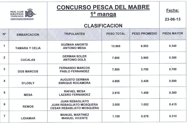 | La noche del sábado dia 22 de junio al domingo 23, tuvo lugar la Primera Manga del tradicional Concurso del mabre Participaron 15 pescadores a bordo de 7 embarcaciones La noche fue muy buena, pero la pesca mas bien escasa. Se pescaron 41´140 kg de mabres, a un promedio de 5´8 kilos por barco y 2,750 por pescador 6 y noche. Se dió la salida a las 10 de la noche del sábado , controlándose el peso entre las 6 y 7 de la mañana del domingo Los triunfadores fueron, por amplio margen de capturas. sobre sus inmediatos seguidores, los concursantes de la embarcación TAMARA Y CELIA , a bordo de la cual, Guzmán Aniorte y Antonio Mesa, pescaron nada menos que 13´865 kg de mabres . Bajo, unas imágenes de la pesca del día, cedidas-como la anterior- amablemente, por el equipo arbitral |