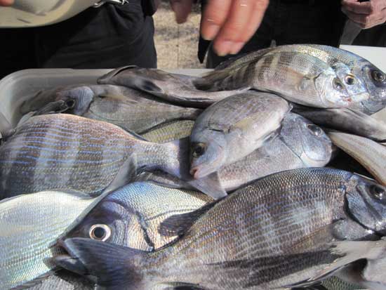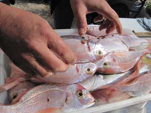| Este Concurso se celebró el dia 16 de febrero. En esta modalidad , se premiaba la cantidad y calidad del pescado. Asi pues, se descartaban, como no válidas, especies como bogas, serranos etc, asi como también, los ejemplares con talla inferior a 20 cm De nuevo el TAMARA Y CELIA ( como en el anterior Concurso) se destacaba de su inmediato seguidor . Participaron 11 embarcaciones, de las cuales presentaron capturas 9. Bajo, dos fotos de parte del pescado conseguido, por el Tamara , grandes chopas y pageles . Pulse fotos para ampliar |