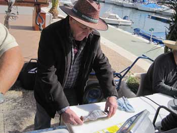 | Bajo, dos fotos del momento del control de peso. En una de ellas Manolo el Contramaestre muestra una de las grandes chopas conseguidas, al tiempo que sus compañeros lucen un vistoso adorno en sus sombreros queriendo simbolizar con él-en plan jocoso,claro,- su respeto y aprecio al medio ambiente .A la derecha, bajo también, midiendo la talla de una chopa | |