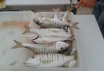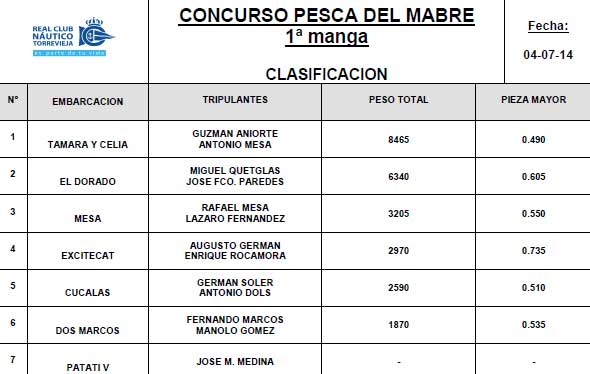| La noche del 4 al 5 de Julio de 2014, tuvo lugar esta primera manga. La tarde anterior hubo viento moderado de leveche que dejó una mar incómoda. Pese a ello se inscribieron 7 embarcaciones (con 14 pescadores a bordo), de las cuales presentaron capturas 6. La mayor parte de los mabres presentados eran buenas piezas, abundando los mabres por encima del medio kilo, como se verá mas adelante. Bajo , una cuantas imágenes facilitadas por el equipo arbitral y por Lorena Guerrero. Gracias por ello |