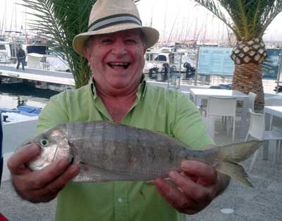| Bajo, la pieza mayor : Un mabre de 735 gr pescado por Augusto Germán.Nuevo record en esta especie Sustituye al anterior récord del Club, capturado por la PITI , que pesaba 705 gr | |