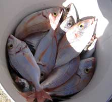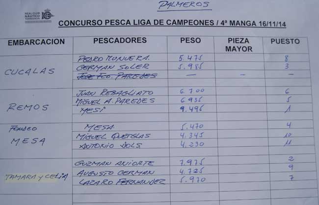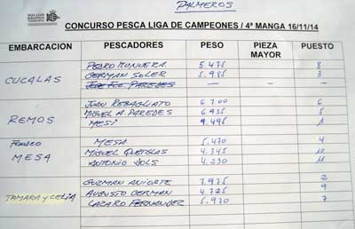 | El día 16 de noviembre se ha celebrado esta cuarta manga de la llamada Liga de Campeones. El pronostico del tiempo daba posibilidad de rachas moderadas de viento del maestral, por lo que el Concurso se realizó cerca de la costa frente a los palmeros de lo Ferris, en 12 a 14 m. de sonda. La pesca, aunque con capturas de tamaño pequeño, fue abundante como veremos | |