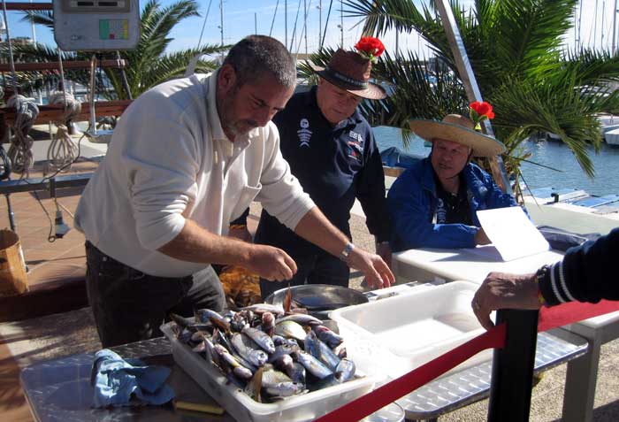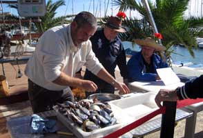 | A la izquierda el jurado, con su tradicional "adorno floral"como simbología ecológica. A la derecha una muestra del pescado, chuclas, pescados roqueros y de algueres, (vacas, tordos, doncellas), raspallones, algunos sargos, salpas, obladas etc) | |