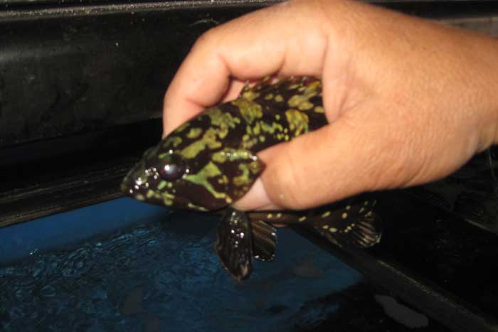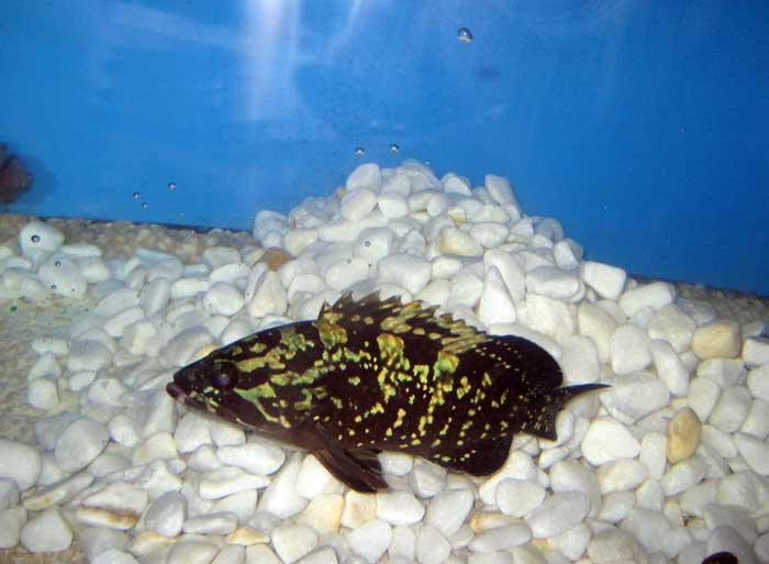 | Arriba a la izquierda una vaca serrana entre dos julias o doncellas. A la derecha y arriba, un precioso ejemplar de pez verde (ofrece multitud de variantes de coloridos), (Thalassoma pavo). Este es mas bien raro en el Mediterráneo . Es un lábrido pero del género Thalassoma . A la derecha debajo de él, Tordo macho (Symphodus mediterraneus) Al seleccionar para medir el pescado apareció un ejemplar que lo habían consevado vivo al no reconocerlo, dadas sus grandes y luminosas manchas amarillas, de lo que resultó ser un mero (Epinephelus Guaza) . Como es sabido, la talla mínima autorizada para el mero, es de 45 cm. Añado una información procedente de la Agencia de Información y noticias científicas" Los investigadores apuntan que “es necesario modificar la talla mínima de captura que está establecida en 45 centímetros , cuatro por debajo de la talla de primera madurez de las hembras”. Y que además “este estudio indica la necesidad de proteger a los ejemplares de mayor talla y edad, a través de, por ejemplo, la creación de zonas cerradas a la pesca”. Este bonito ejemplar de mero juvenil, fué llevado, en perfectas condiciones, al acuario del RCN, como pueden observar en las siguientes imagenes donde se ve en el momento de echarlo y dentro del acuario |