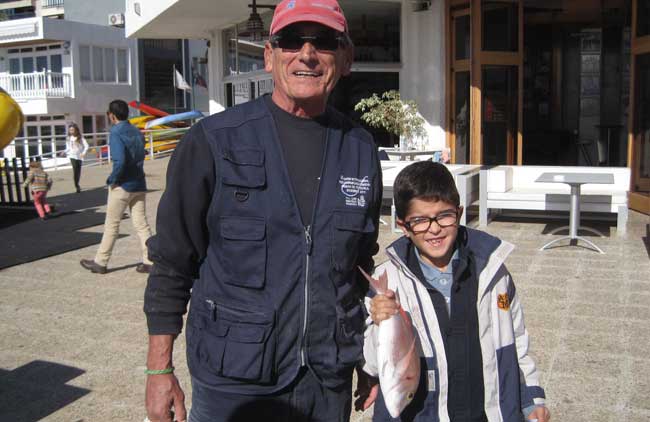 | Bajo les ofrezco imagenes de una bonita pesca de pagel, fuera de Concurso, de la embarcación Teloc, que pese a la mala mar y al viento del maestral aguantaron pescando en unos 50 m. de sonda. En la foto, el patrón del Chole y su nieto con un buen pagelón | |