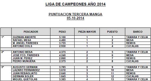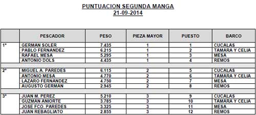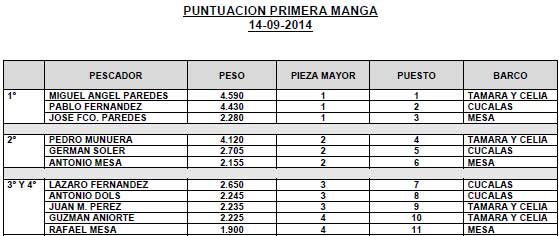 Participaron 12 pescadores a bordo de 3 embarcaciones. El sistema de clasificación consiste en seleccionar los primeros de cada barco como los 3 primeros de la clasificación general, resultando el primero, el que mas pescado capture de los 3. Y asi con los segundos de cada barco que ocuparían los puestos 4º-5º y 6º segun el pescado capturado. Pudiéndose asi dar las circunstancia, (como en esta manga) que por ejempo el 4º clasificado en la general, capture menos pescado por ejemplo que el 9º.