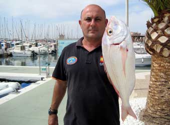 | Arriba a la izquierda, una de las capturas presentadas, con chuclas, serranos, jureles, besugos y un precioso salmonete de mas de 200 gr. A la derecha, la mejor captura la logró Antonio Mesa con ese enorme pagel. Pulse imagen para ampliar |