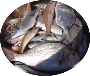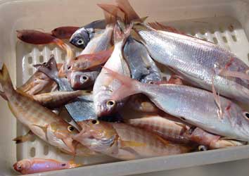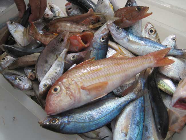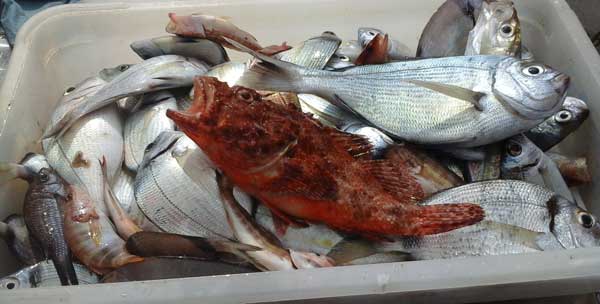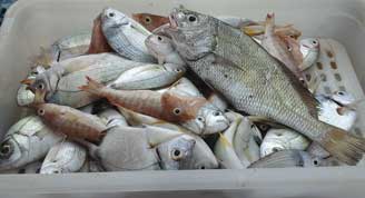 Arriba, dos de los mejores "ranchos" presentados y una muestra de la clase de pescado de la zona : Algun pargo, unos pocos pageles, alguna vidriada y chopa y sobre todo serranos . Pulse imágenes para ampliar
