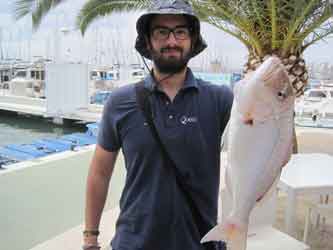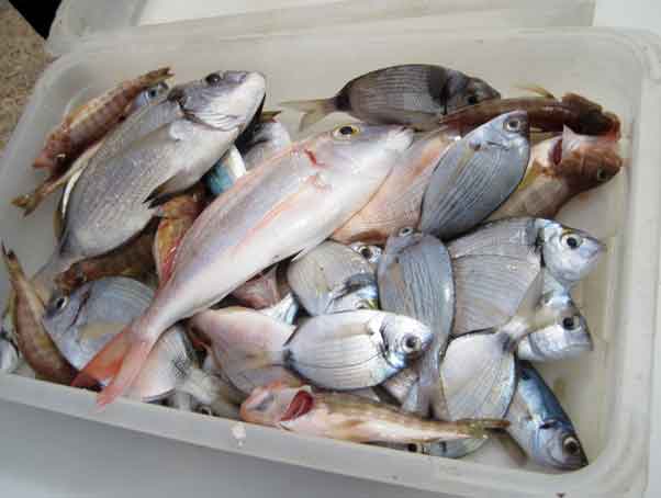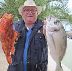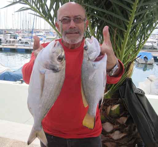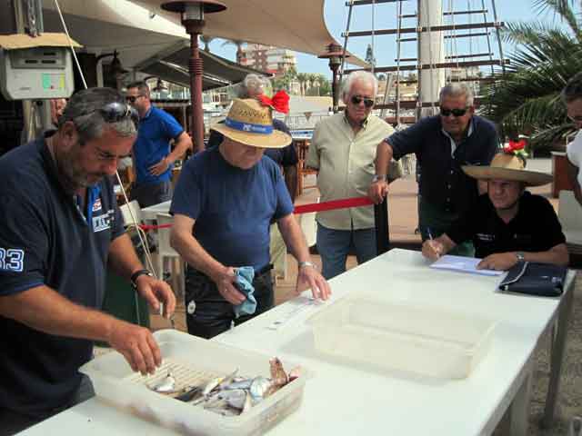 | Esta segunda manga del Campeonato a dúos, valedero para seleccionar los equipos que concurrirán en Campeonatos nacionales, se celebró , con un tiempo expléndido, a pocas millas del puerto, en 35 a 37 m. de sonda, en el paraje conocido como Junquicos (El monte Junquet, o Atalayón enfilado con la Isla Grosa) . Participaron 10 equipos de 2 pescadores cada uno , a bordo de 5 embarcaciones. Capturaron 41 kg de pescado, a un promedio aproximado de 2 kg por pescador El pescado como se verá mas bajo, fue muy variado, y en términos generales mas bien pequeño, con muchos descartes, aunque hubo piezas notable como las que se muestran en la portada y debajode estas líneas |