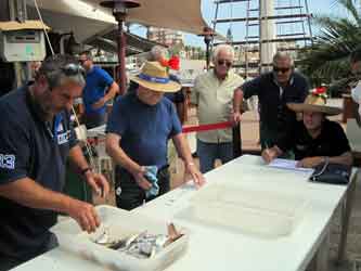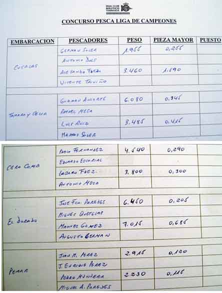 Arriba a la izquierda, la mejor captura: la del equipo formado por Alejandro Férnandez y Vicente Triviño. Un dentón que pesó 1.590 . Al parecer, según comentó algún participante, hubo varias roturas, de las finas camadas que se emplearon, probablemente motivadas por el ataque de grandes corvas o dentones