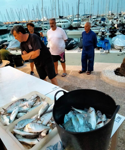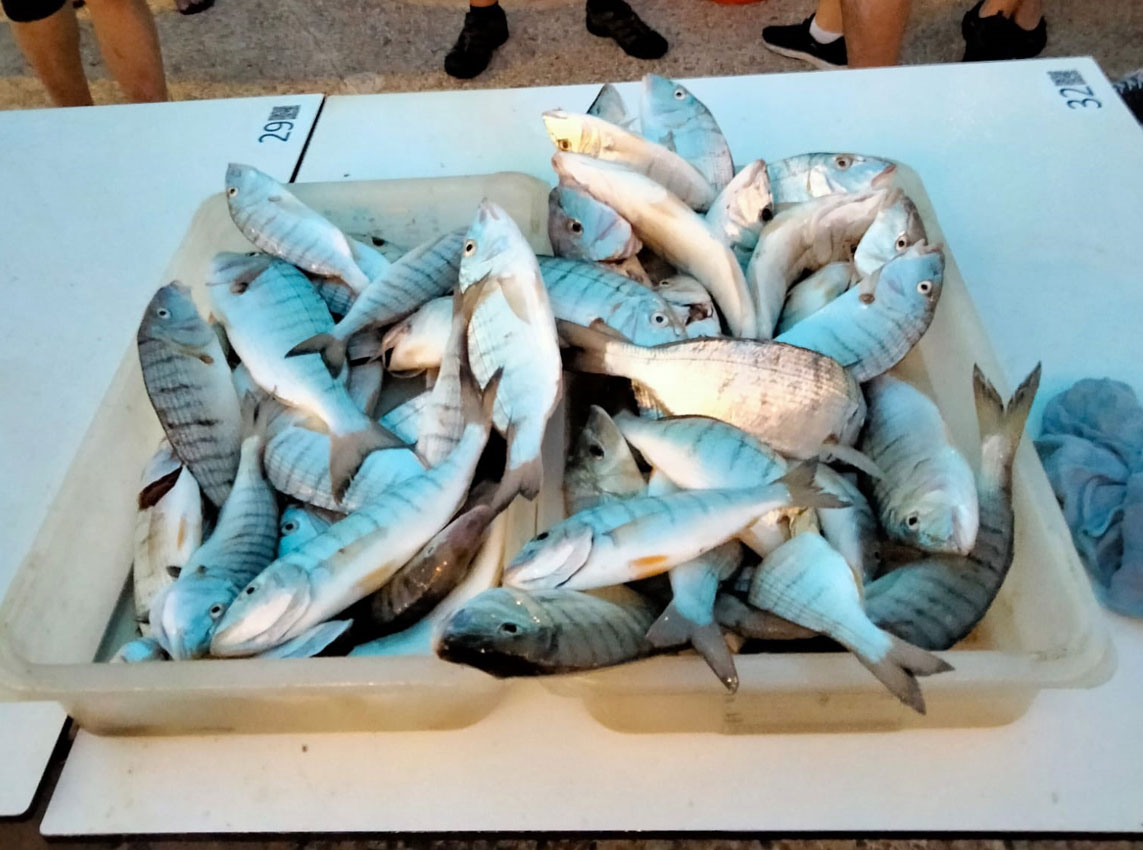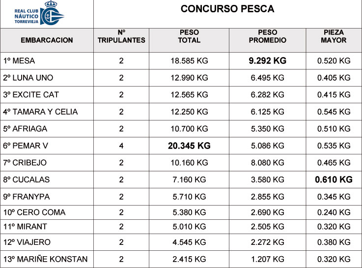 La noche del 24 al 25 de julio se celebró esta segunda manga de la pesca el mabre, con gran participación de aficionados y con unos resultados diría que espectaculares . En efecto, se inscribieron 13 embarcaciones , abordo de las cuales iban 28 pescadores. La salida se díó a las 9 de la noche, siendo el periodo válido hasta las 6,30 de la mañana La noche de luna llena iluminaba una mar preciosa , ideal para esta clase de pesca tan arraigada en Torrevieja .Presentaron al peso, 61´800 kg de mabres de buen tamaño, con un promedio de 4´750 kg por barco y 2´200 por pescador. Una cantidad bastante aceptable, dado lo específico de esta pesquera, limitada solo al mabre La clasificación general se verificó por promedio por pescador Bajo unas cuantas imágenes de esta pesquera, ofrecidas por el Contramaestre Manolo Muchas gracias |