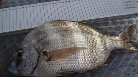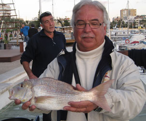 Arriba, dos de las piezas mejores .Un Dentón de 1,135 capturado por Quetglas y Mazón , y a la derecha un bonito sargo imperial de 950 gr |