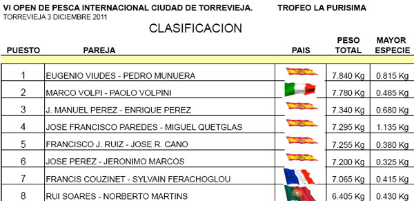 | Este importante acontecimiento deportivo ha resultado un rotundo éxito de organización y participación. En efecto se presentaron 46 equipos formados por dos pescadores cada uno, provinientes de localidades situadas en Baleares, Portugal, Francia, Italia Valencia, Isla Canela Canarias Etc Bajo los equipos de Portugal y Francia
