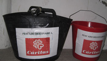 | Bajo una muestra del pescado de la zona, pageles, vidriadas, alguna corva, aligotes, serranos etc...y en la otra foto una muestra también de la solidaridad de los organizadores y participantes. Mas de 35 kg de las capturas, fueron destinadas a la Casa de la Caridad de Orihuela, previo acuerdo con la Directora de la Cáritas de Torrevieja, Araceli Die.Pulse para mas info |