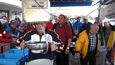 ![]() Llegada de la embarcación Josper. Uno de los tripulantes , del equipo francés, comprueba sus capturas que sobrepasaban los 7 kg |