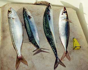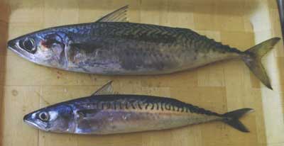 La caballa( Scomber scombrus ) y el estornino( Scomber japónicus )-muy parecido a la anterior- pertenecen a la familia de los Escómbridos emparentados de cerca con melvas, atunes, bonitos y alalungas.Abundan en todos los mares acercándose a la costa durante los meses cálidos y viviendo en aguas más profundas (125 a 300 m.) durante el invierno. La caballa o verdel abunda más en el Atlántico que en el Mediterráneo. España captura cerca de las 35.000 toneladas anuales. Con relación al estornino, muy abundante también, las capturas mundiales del mismo rondan los dos millones de toneladas anuales. Ambas especies caballa y estornino, (también llamado visol o makarel), son a veces difíciles de distinguir por el aficionado.Se diferencian, como se ve claramente en la fotografía que acompaño, en que la primera aleta dorsal de la caballa tiene once a doce radios en vez de los 7 a 9 del estornino.Los ojos de la caballa son mucho más pequeños que los del estornino.El cuerpo de la caballa es mas esbelto que el del estornino que es más rechocho, y el colorido de las manchas sinuosas del dorso son más brillantes y nítidas en la caballa que en el estornino.Pero es que además éste tiene unas manchas negras difuminadas en la parte inferior de su cuerpo , por debajo de la línea lateral que no existen en la primera. |