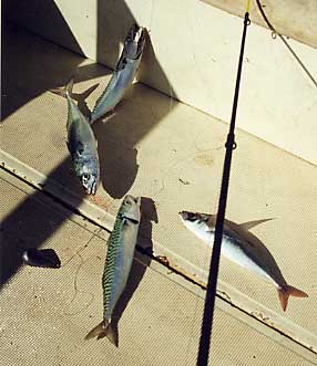 Mis compañeros se valieron de otros trucos, como el del cronometrado del tiempo de caída del aparejo, o el tanteo cada poco tiempo del descenso del mismo, moviendo éste alternativamente arriba y abajo hasta notar la picada. El marcaje de la línea con la pequeña tira de plástico blanco, me hizo controlar mejor la banda de pescado que aparecía en la sonda y del modo que lo hice no entorpecía la libre salida de la línea. Un poco antes de llegar mi aparejo a la profundidad marcada, interrumpía bruscamente la caída del plomo, para soltar la línea con igual brusquedad a continuación. Estas sacudidas estimulaban por lo que se ve el acoso de las caballas. De todos modos hay que decir que son peces muy voraces y confiados y si había en su zona algun anzuelo cebado, la pesca continua estaba asegurada. En el mismo estrato o profundidad en la que estaban, había también jureles y un poco más profundamente era el dominio de las bogas.