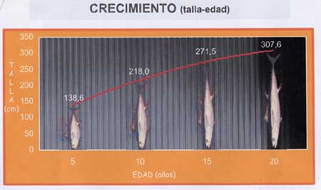 Partiendo de la premisa de que el atún nace en nuestra zona del sureste de España y sur de Baleares a finales de mayo o primeros de junio, a mediados de agosto es decir 2 meses y medio después capturamos ya algunos ejemplares que tienen unos 20 cm y 200 gr. de peso. Al finales del mes siguiente es decir a los 4 meses tienen ya un kilo, alcanzando los dos kilos, a dos kilos y medio, a primeros de noviembre, a los 5 meses de edad.