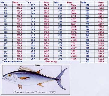 | Tabla moderna confeccionada con el estudio de miles de atunes publicada por el I.O. de MÁLAGA |