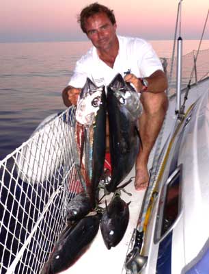 Aún capturamos antes de llegar a Cerdeña 4 albacoras de 6 a 9 kilos. Nuestra nevera estaba a tope, por lo que el Capi abrió alguna albacora y la puso a salar, para posteriormente, colgarlas al sol y al viento de los estays y obenques.