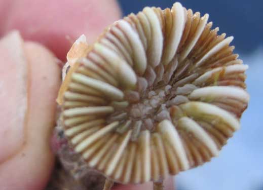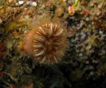 La foto del centro es realmente un coral. Creemos- dice J.A. Pujol y otros -que pertenece, como ya me adelantó, al género Caryophyllia (probablemente Caryophillia inornata), pero también podría pertenecer al género Balanophylla. También se haría preciso un análisis bajo lupa de ciertos caracteres anatómicos. Ver abajo otra imagen del mismo, tomada de http://skaphandrus.com/, en el fondo del mar.