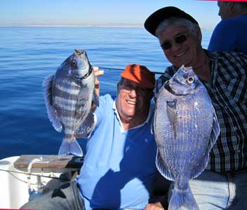 | Arriba, En el centro, el patrón Jose Luis, con uno de los muchos pargos que entraron a los ermitaños. A la izquiera Antonio con un pagelón de medio kilo. A la derecha con otro pargo |