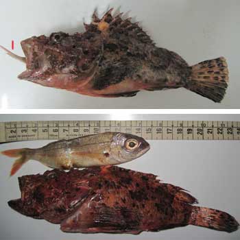 | Arriba a la izquierda, vidriada o mojarra. En el centro lo que parece una gallina o cabracho, pero es una rascasa de 400 gr y 28,5 cm (tamaño máximo 30) (Pulse imagenes para ampliar) . A la derecha , escórpora .Fíjense el tamaño del ojo, su posición en la cabeza y la escotadura craneal detrás del ojo |