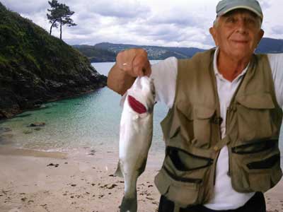 Esta vez me remite una bonita foto de una lubina de 40 cm y cerca del kilo de peso, pescada en la Ria de Cedeira en la Coruña. Ese día le entraron 3 mas, pero de menor tamaño.Las pesca desde una chalana con motor fuera de borda.Me cuenta que pese a la abundancia de picadas, las tuvo que dejar, pues la marea baja, le estaba dejando sin fondo. Utiliza linea plomada de una 14 brazas, empleando de señuelo vinilos preferentemente de colo blanco (pulse imagen para ampliar)