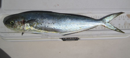 Lampuga de 49 cm y 720 gr de peso.Con esta talla y peso dan ya buen juego. Entró a un calmarito de vinilo rojo y blanco |